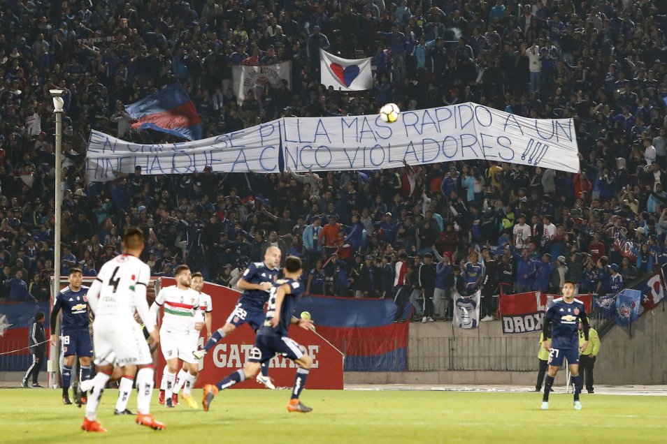 Un sector de la barra de Universidad de Chile desplegó un polémico lienzo que decía “En Chile se pilla más rápido a un hincha que a cinco violadores” en claro respaldo al sujeto castigado por la burla a Raimundo Tupper.