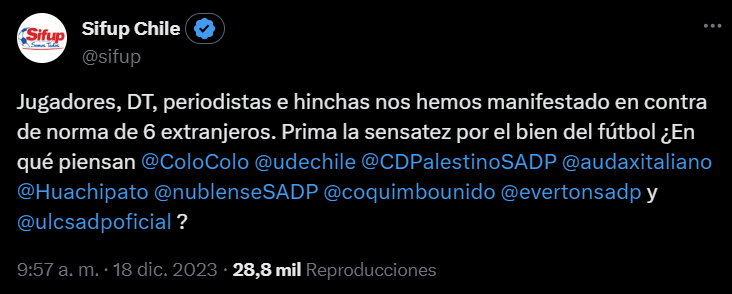 El Sifup apuntó a los nueve clubes que impulsaron e hicieron posible el polémico aumento de los cupos de extranjeros en el Campeonato Nacional a seis por equipo, que arrancará desde el torneo 2024.