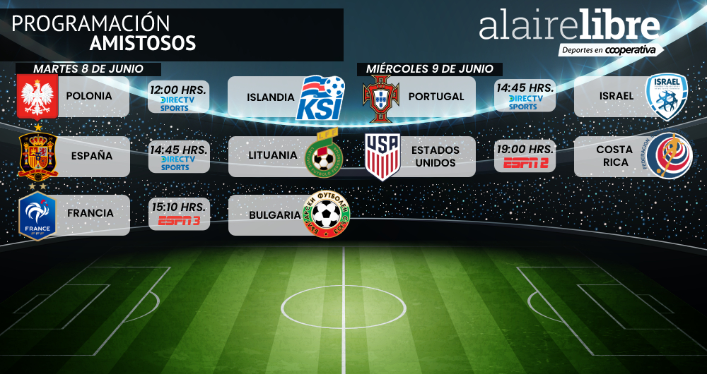 En la previa del inicio de la Eurocopa y Copa América, esta semana, entre este martes y miércoles, la acción del fútbol estará cargada con amistosos de selecciones y las Clasificatorias de Conmebol para el Mundial de Qatar. Revisa cuándo y dónde ver en la agenda de TV de AlAireLibre.cl