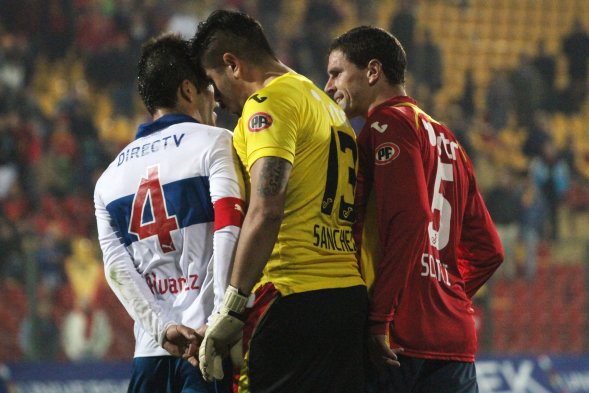 Otra mirada a la pelea entre los jugadores de la Universidad Católica y Unión Española en el Estadio Santa Laura.
