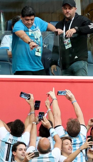 En su particular estilo, el ex jugador y ex seleccionador Diego Maradona alienta a la albiceleste con un lienzo de sí mismo durante el partido clave ante Nigeria por el Grupo D del Mundial de Rusia 2018.