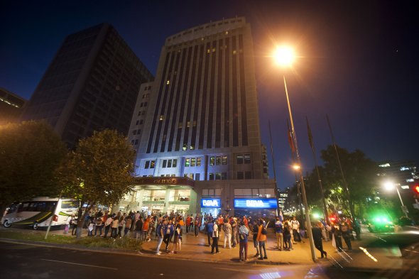 Hinchas de Universidad Católica visitaron el hotel de concentración del equipo, lugar en que realizaron el tradicional “banderazo” en la previa al pleito con Colo Colo de este sábado.