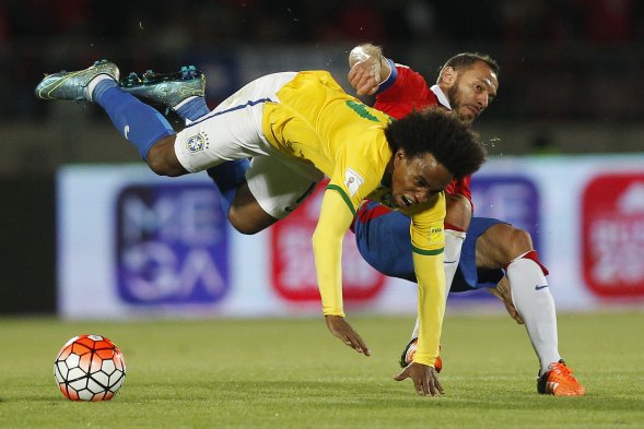 El volante chileno Marcelo Díaz frenó con una fuerte entrada un contragolpe del brasileño Willian en el duelo por las Clasificatorias.