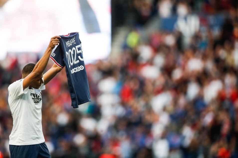 El presidente de PSG, Nasser Al-Khelafi, anunció ante los hinchas en el Estadio Parque de los Príncipes la renovación de Kylian Mbappé, quien se quedará en el club hasta 2025.
