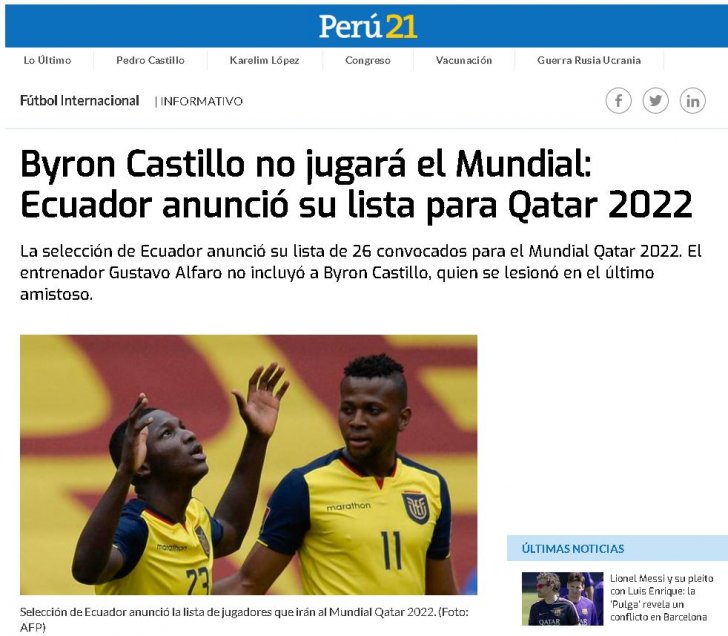 El lateral Byron Castillo se quedó afuera del Mundial de Qatar 2022 luego de conocerse el dictamen del TAS y generó una ola de reacciones de la prensa sudamericana.
