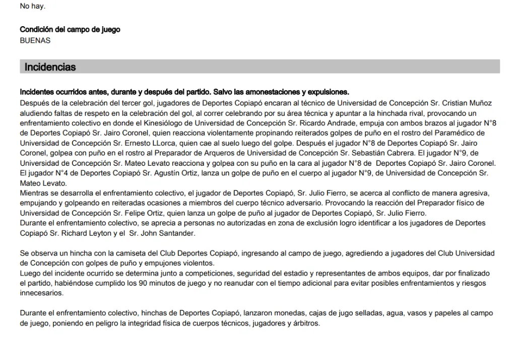 El documento detalla que jugadores de Copiapó encararon al técnico de la UdeC por una celebración dentro de su área técnica, lo que provocó un enfrentamiento colectivo. Luego sube el nivel del conflicto: el kinesiólogo de la U de Concepción empujó al jugador Jairo Coronel de Copiapó, quien respondió con golpes al paramédico y al preparador de arqueros rivales.
