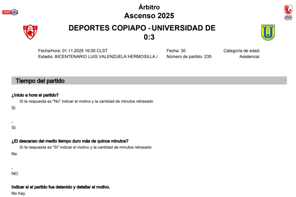 Dos equipos, alta tensión y un ascenso que debió celebrarse como victoria, pero terminó en enfrentamiento. En la instancia crucial del torneo de la Primera B, el choque entre Deportes Copiapó y U de Concepción dejó escenas que el informe arbitral del juez Juan Lara califica de “inaceptables”.