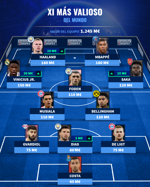 El francés Kylian Mbappé, valorado en 180 millones de euros, como el noruego Erling Haaland, y el brasileño Vinícius Junior, en 150, son los tres futbolistas con mejor valor de mercado tras el final de la pasada temporada y así formarían en un equipo ideal con otros de gtran precio, según el portal Transfermarkt, de acuerdo a lo mostrado en el club que defendieron durante el periodo 2022-2023.